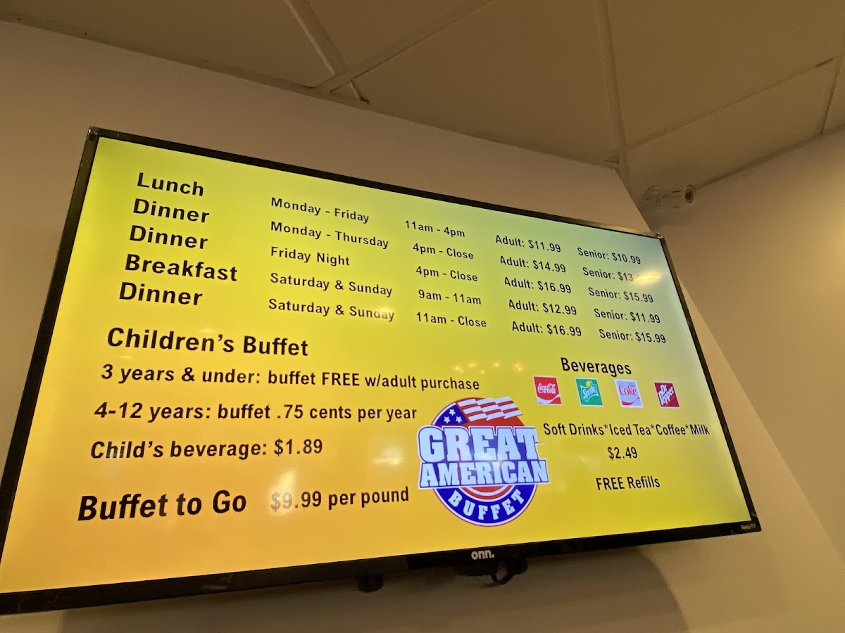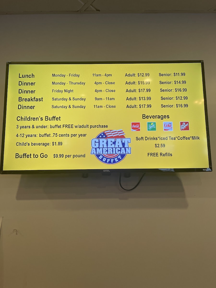 The menu at Great American Buffet offers a straightforward, comforting selection of classic American buffet fare. It’s the kind of place where you can expect familiar, hearty dishes served in generous portions, designed to satisfy a range of tastes and appetites throughout the day.